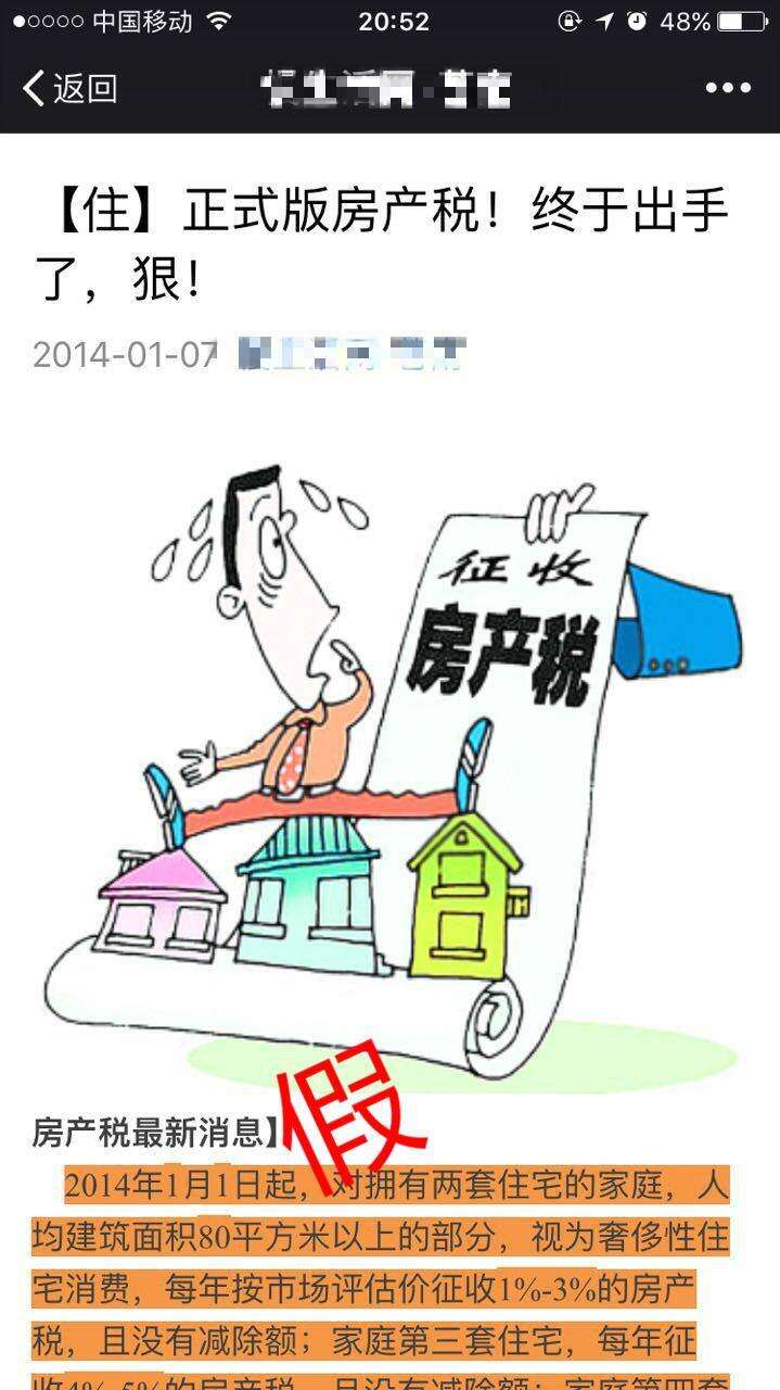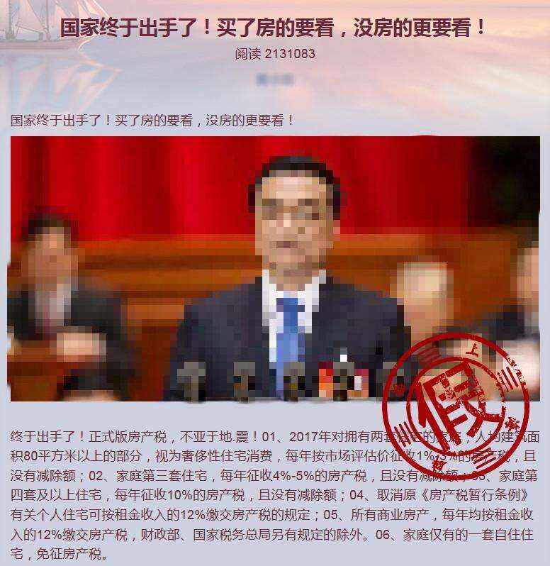 解放日报·上观新闻记者看到,这篇《国家终于出手了!买了房的要看,没房的更要看》一开头就开门见山指出“终于出手了!正式版房产税不亚于地震”,列举了所谓2017版房产税的六条细则。其中第一条,就直指拥有两套住宅的家庭,“人均建筑面积80平方米以上的部分,视为奢侈性住宅消费,每年按市场评估价征收1%-3%的房产税”。第二条至第五条,概括了多套房产的征税比例。第六条称,家庭仅有的一套自住住宅,免征房产税。