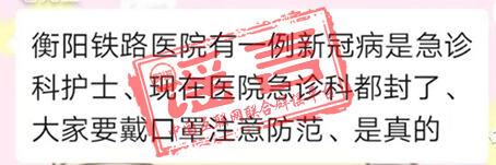 浙江辟谣网据衡阳日报公众号消息:衡阳朋友圈近日流传一则 “衡阳铁路医院护士感染新冠肺炎”的消息。