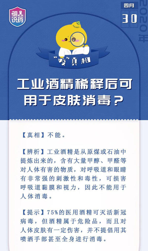 浙江辟谣网据药葫芦娃微信公众号消息:【谣言】工业酒精稀释后可用于皮肤消毒?【真相】不能!工业酒精对人体有害。