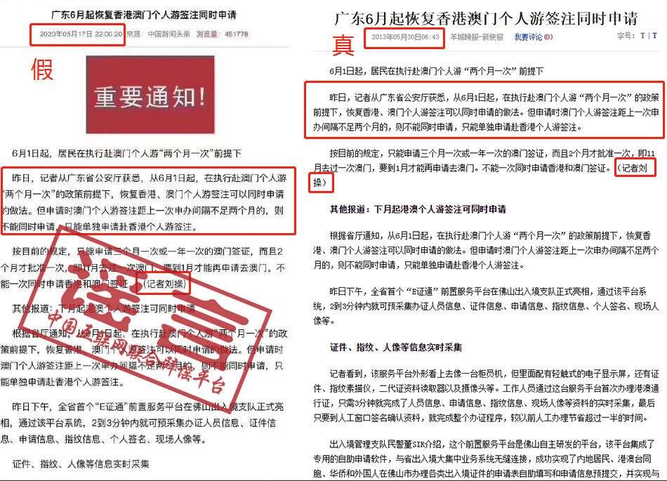 浙江辟谣网据中国互联网联合辟谣平台消息 近日,有关“广东省将于6月起恢复港澳自由行签注申请”的消息在网上流传,引发网民关注。网传消息称是广东省公安厅发布的政策。查证发现,广东省公安厅、广东省公安厅出入境管理局等平台均无相关消息。网传消息系将2013年5月30日的一则旧闻,修改日期后在网上发布,所谓的消息实则为旧闻新传。请广大网民关注官方权威消息,切勿信谣传谣。