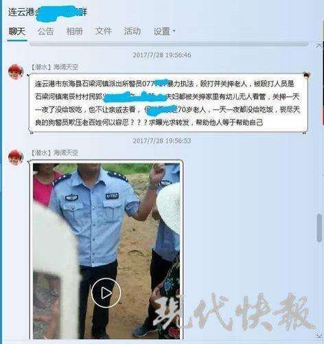 民警暴力执法的信息最早出现在7月28日,在连云港某QQ群内,一名网友发帖称连云港市东海县石梁河镇派出所警员077717暴力执法,殴打并关押老人,还配有视频。