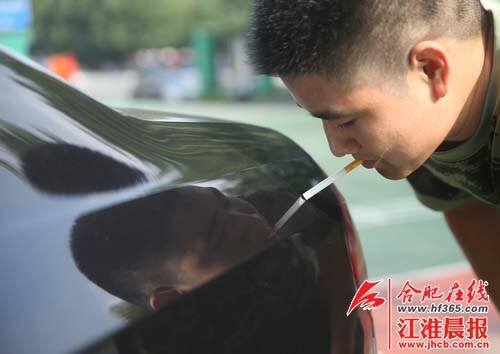 8月4日下午3时30分许,合肥最高温度达36℃。在瑶海消防中队,记者选择一辆在外暴晒已有4小时的黑色轿车,并用红外线温度计测量车辆前盖温度,高达52.2℃。实验人员将香烟烟头对准车身,开始吸烟,等待4分多钟,香烟并没有燃烧。