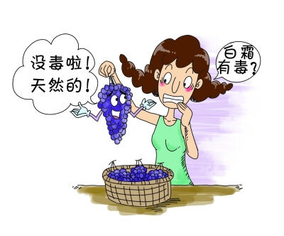 最近,市民吴女士有些烦恼,朋友送她的一筐葡萄,每颗上面都裹着厚厚的白霜,她的邻居告诉她,一定要将白霜洗干净了再吃,否则就会中毒,因为白霜是农药。吴女士为难了,因为她发现怎么洗,白霜都干净不了,她吓得不敢吃了。于是,那一筐葡萄没几天烂了一大半。