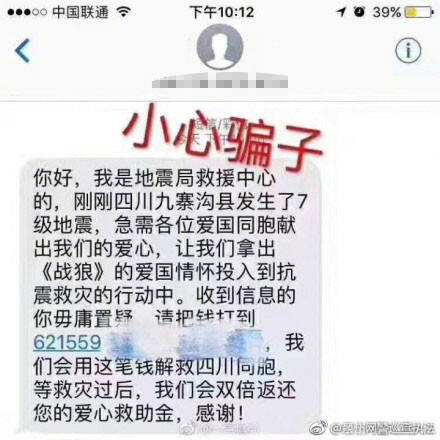 【传闻】有部门网民表示收到地震局救援中心发来的呼吁捐款的短信,短信中提到,请市民将钱打入某账号,该款项将全部用于四川地震救灾,同时,承诺灾后将双倍返还捐款金额。