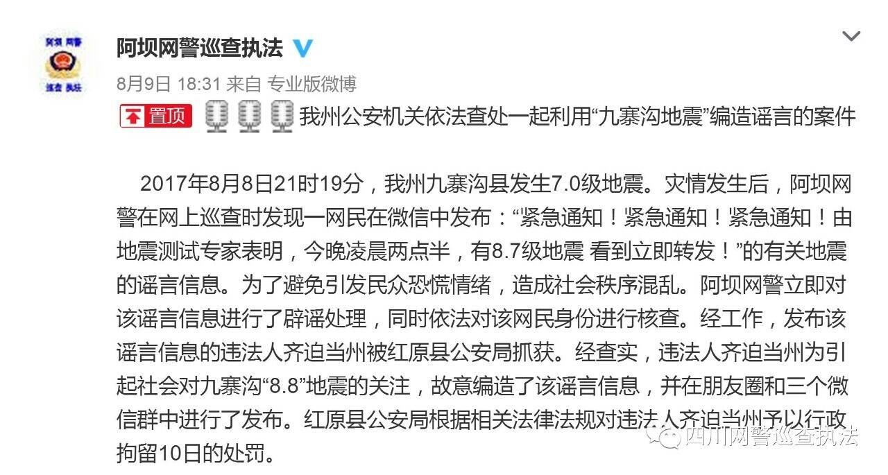 目前,涉及九寨沟地震的两起谣言造谣者已被警方查处。