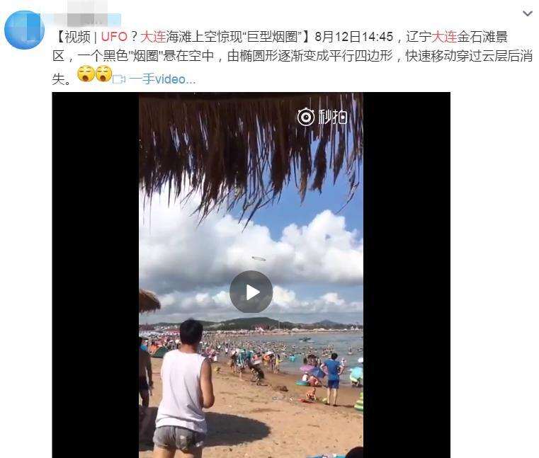 一段声称“大连海滩上空惊现不明物体”的视频在网络上热传。视频的解说和文字说明称:8月12日14时45分,辽宁大连金石滩景区,多名游客目击一个巨型黑圈悬在空中,由椭圆形逐渐变成平行四边形,快速移动穿过云层后消失。