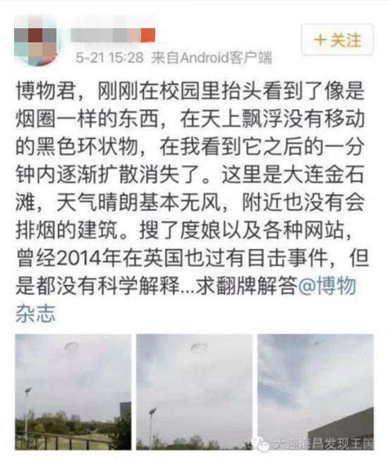 根据网友提供的信息,解放日报·上观新闻记者输入金石滩、烟圈等关键词进行搜索,发现视频中的巨型黑圈去年就曾在金石滩附近的空中出现过,还被网友发现并拍照上传网络。据半岛晨报报道,2016年5月21日,大连一位网友把金石滩上空拍摄到的“黑圈”照片发到微博上,并求助这一神秘景象形成的原因。在该网友发布的3张照片中,烟圈的形状并不一样,而且随着高度不断变化,最开始是较为规则的圆形,升高后则变成了不规则的锥子形。1分钟后,它就逐渐扩散消失了。
