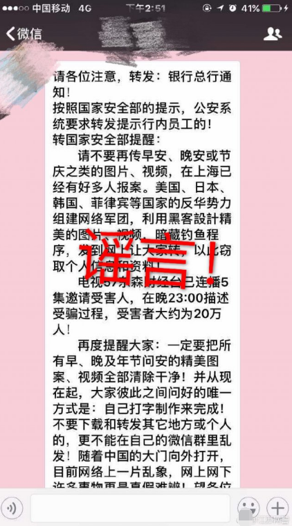 近日,疯传一条信息称,请不要再传早晚安或节庆图片视频,里面暗藏钓鱼程序,会盗取个人信息和资料。对此,江苏省公安厅网络安全保卫总队官方微博“@江苏网警”进行辟谣。