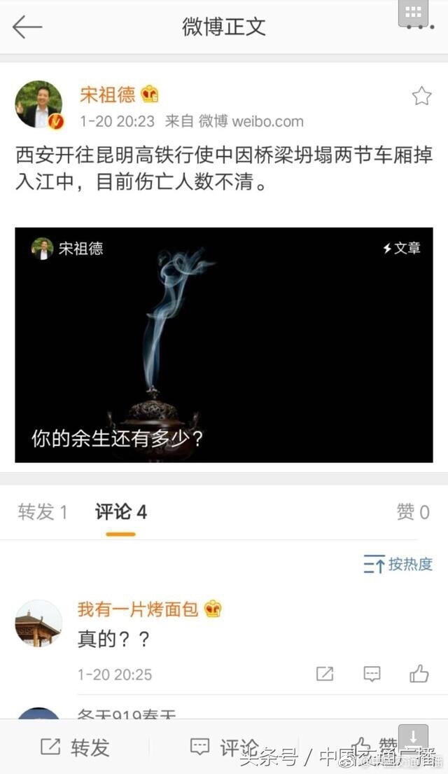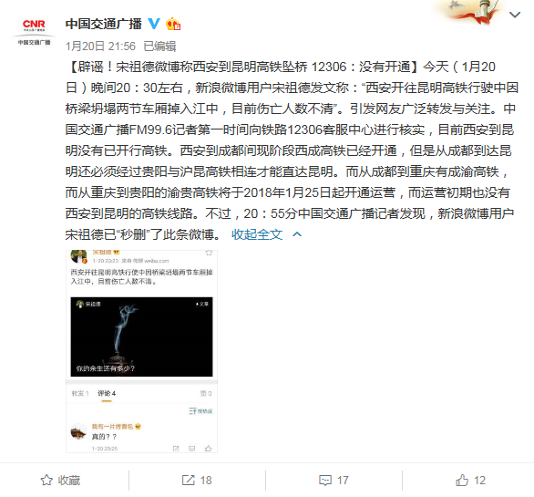 1月20日晚间20:30左右,新浪微博用户宋祖德发文称:“西安开往昆明高铁行驶中因桥梁坍塌两节车厢掉入江中,目前伤亡人数不清”。引发网友广泛转发与关注。