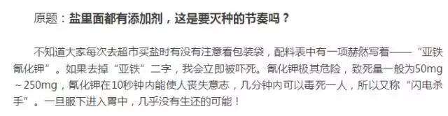 因此如果有人说你每天吃的盐里暗含着惊天阴谋,你一定后脊梁骨都凉透了吧?其实也不必,毕竟常看食今不昧的人什么谣言没见识过,德国人不喝纯净水啦,吃面包等于吃化肥啦,豆浆导致乳腺癌啦……早就习惯咯
