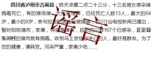 有网民在泸州本地社交媒体发布信息称:昨天凌晨二点二十三分,泸州古蔺县十三名男女感染猪病毒死亡,有的猪场猪,大批被埋葬,已经死亡人数13人,最大的64岁,最小的9岁,参与抢救的医生已被隔离,四川1台电视新闻己播岀,暂时别吃猪肉,家禽,特别是猪肉,目前四川有167个已感染,正定县朱河村的猪肉就有病毒……