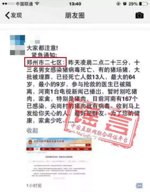 2017年5月21日,石家庄市正定县网民李某某造谣正定县朱河村“13名男女感染猪病毒死亡”,2017年5月25日,正定县公安局以虚构事实扰乱公共秩序,依法对其处以行政拘留10日的处罚。