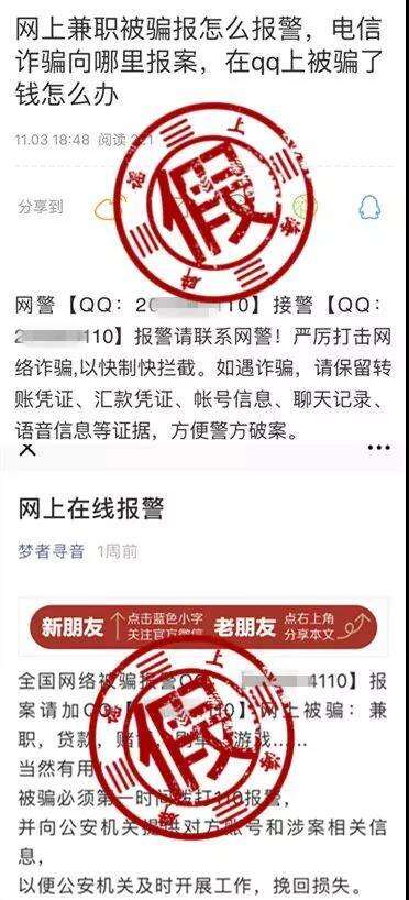 近日,多条“网上被骗可以在线报警”的网帖在微博、微信中流传。帖子称,如有网友遭遇网络诈骗,可添加“网警QQ”在线报警,帖子里还有模有样地写着“网上被骗:兼职、贷款、赌博、刷单,全国报案请加QQ:850**110”。