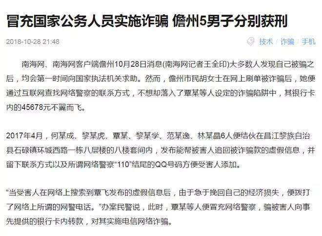 已有骗子因为冒充网警受到惩处。据南海网报道,2017年4月,海南儋州6名男子冒充国家公务人员,在网络发布能帮被害人追回被诈骗款的虚假信息,并留下联系方式以及所谓网络警察的QQ号码,方便受害人添加。6人共诈骗获利62097元,分别获刑3年到6年不等。