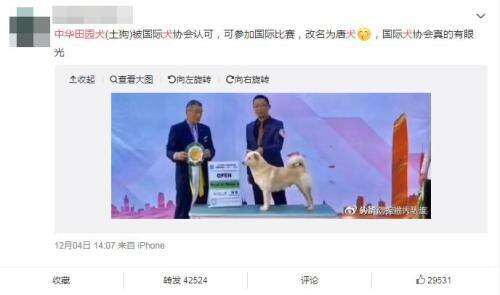 网友误认为“中华田园犬改名唐犬”,并认为中华田园犬获得了国际认可。微博截图