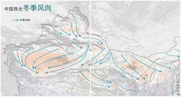 中国新疆地区冬季的风向主要为西北风,这股风干冷、势力强劲。加上准噶尔盆地夹在高大的天山山脉和阿尔泰山山脉之间,形如窄口偏南的喇叭,西北风集中且威力加强,把沙尘扬起。