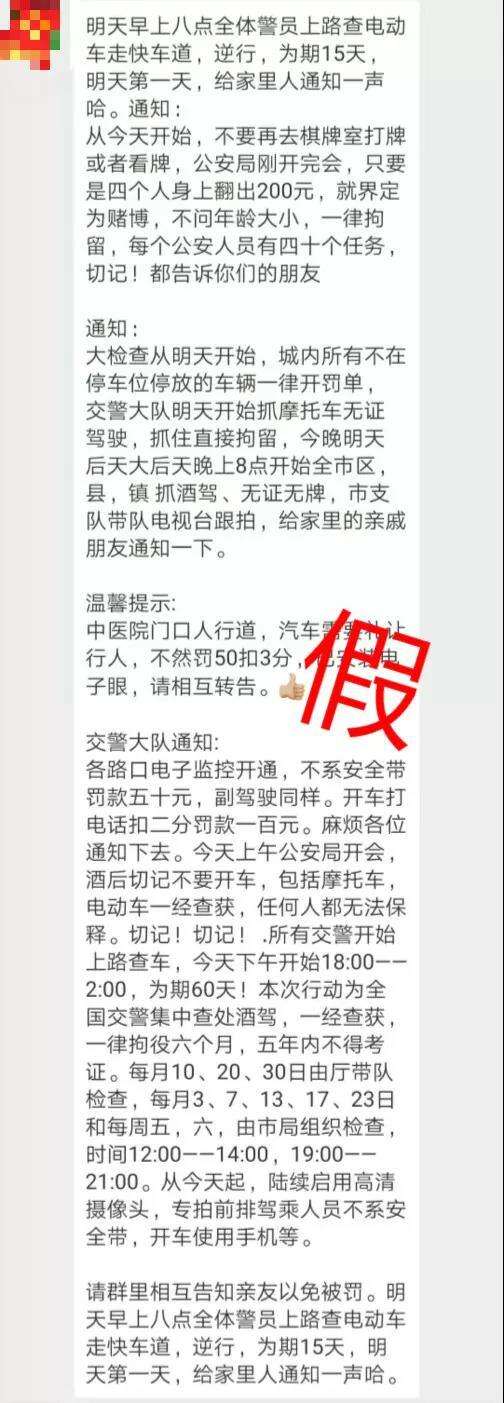 “请群里相互告知亲友以免被罚。明天早上八点全体警员上路查电动车走快车道,逆行,为期15天,明天第一天,给家里人通知一声哈。”“通知:大检查从明天开始,城内所有不在停车位停放的车辆一律开罚单,交警大队明天开始抓摩托车无证驾驶,抓住直接拘留,今晚明天后天大后天晚上8点开始全市区,县、镇抓酒驾、无证无牌,市支队带队电视台跟拍,给家里的亲戚朋友通知一下。”