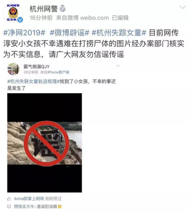 有人造谣走失女孩被找到?网警辟谣