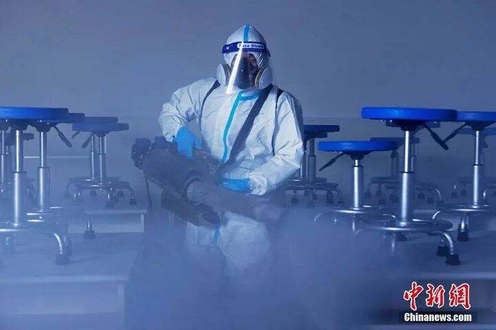 上海浦东三栖应急救援志愿服务队队员对长岛中学进行全面消杀作业。殷立勤 摄