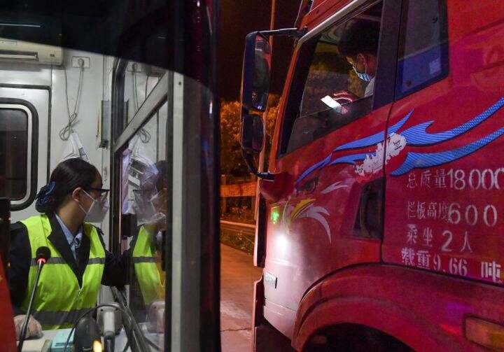 4月23日凌晨,货车司机杜凤洋(右)在上海嘉西收费站向收费员出示电子通行证。新华社记者 李贺 摄