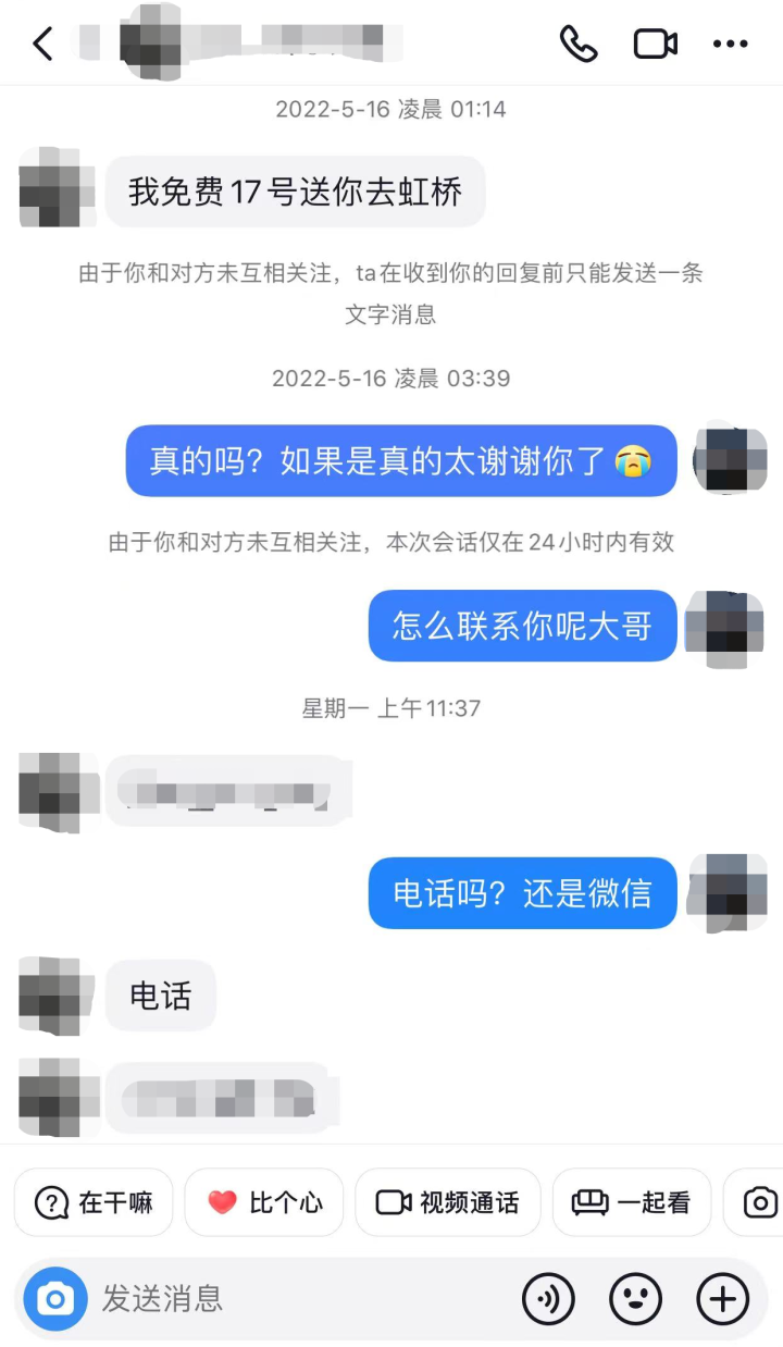 16日凌晨3点,吴涛生迷迷糊糊醒来,发现后台收到了一条陌生人的私信:“我免费17日送你去虹桥。”