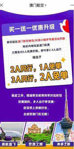 澳门航空更是在机票“买一送一”的基础上,加推机票“买一送一PLUS”活动——只需支付1人机票价格,即可享2-3人出行。相当于 2人同行,1人免单;3人同行,2人免单。除此之外,燃油费及税费同享对应折扣。