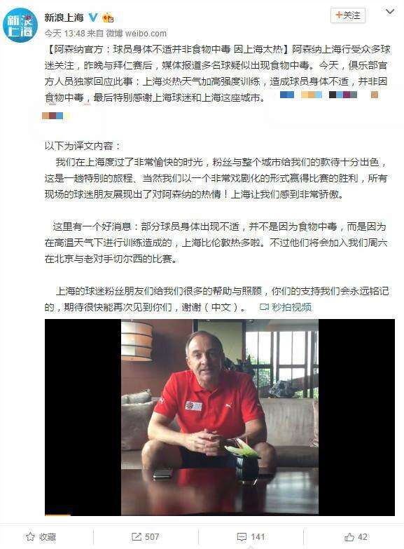 这里有一个好消息:部分球员身体出现不适,并不是因为食物中毒,而是因为在高温天气下进行训练造成的,上海比伦敦热多了。不过他们将会加入我们周六在北京与老对手切尔西的比赛。