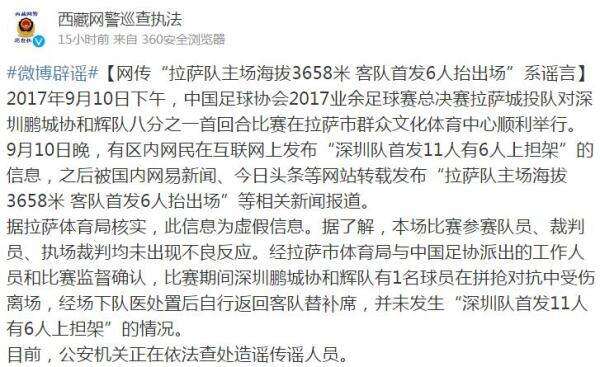9月10日晚,有区内网民在互联网上发布“深圳队首发11人有6人上担架”的信息,之后被国内网易新闻、今日头条等网站转载发布“拉萨队主场海拔3658米 客队首发6人抬出场”等相关新闻报道。