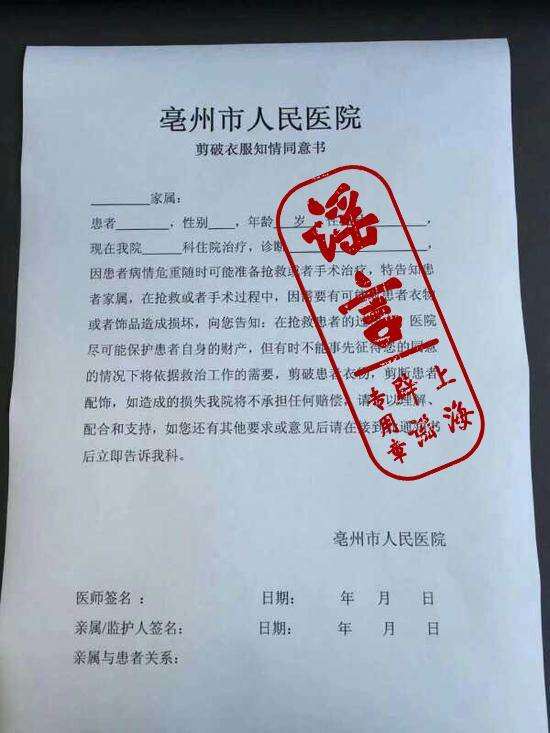 亳州市人民医院相关负责人日前向媒体辟谣称,网传《剪破衣服知情同意书》是假造的,医院没有这样的规定,该怎样治病救人还是怎样。该医院的多名急诊科室医务人员也表示,没有见到过这份文件,也从未听闻医院有类似规定出台。