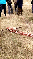 近日,一段“天降龙骨,肉被吃光”的视频在网上流传。视频中,一副长约20米的骨架整齐地排列在草地上,头骨上有两个明显的犄角,像极了神话故事中龙的形象;骨头上沾染着一些红色的血迹,仿佛“龙肉”刚刚被啃食完;在骨架周围,站着不少围观群众。视频配音煞有介事地说:“(某地)出现龙了,不知道怎么回事,这肉儿都被吃了”。