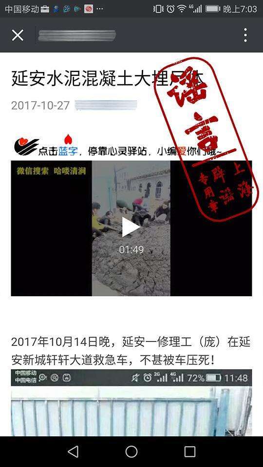 这样来看,网传“混凝土埋人”视频只是截取了事件经过中的一小段。随后,陕西省门户网站陕西网旗下微博“@陕西省延安站”发布的情况说明证实了记者的猜测,“混凝土埋人”的网传信息与实际情况不符。