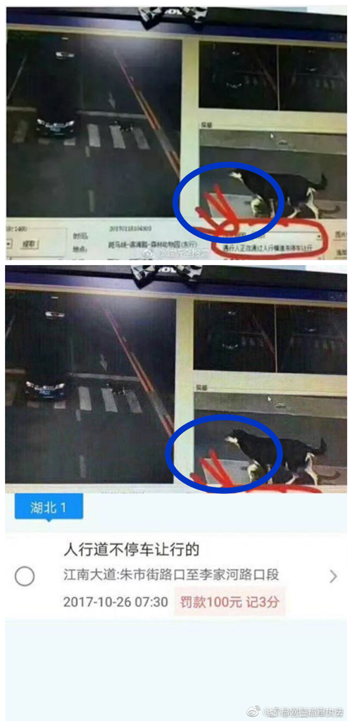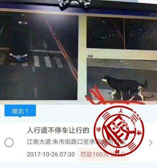 近日,一张“斑马线前未礼让狗而被记违章”的图片在微博和朋友圈中引发热议。网传图片分为抓拍照片和文字记录两个部分,其中的抓拍照片显示一辆黑色轿车正在通过斑马线,车头左侧的斑马线上站着一条狗,四周并无任何行人。下方的文字记录显示,这个场景发生在2017年10月26日7时30分,湖北宜昌市的江南大道某路口,车主因“人行道不停车让行”被罚款100元,记3分。