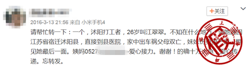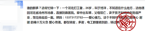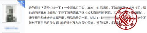 近日,一条“于博洋的亲属重伤,想见他最后一面”的寻人贴在朋友圈和贴吧广为流传。网帖称:“谁的群多?请帮忙转一下:一个河北打工者,26岁,叫于博洋,不知道在什么地方,请他速回河北省沧州市沧县,直接到县医院。家中出车祸,父母双亡,妻子孩子和妹妹伤势很严重,想见他最后一面。姨妈:1337317XXXX——爱心接力。这个不转对不起自己的良心,谢谢,的确十万火急,爱心传递。”