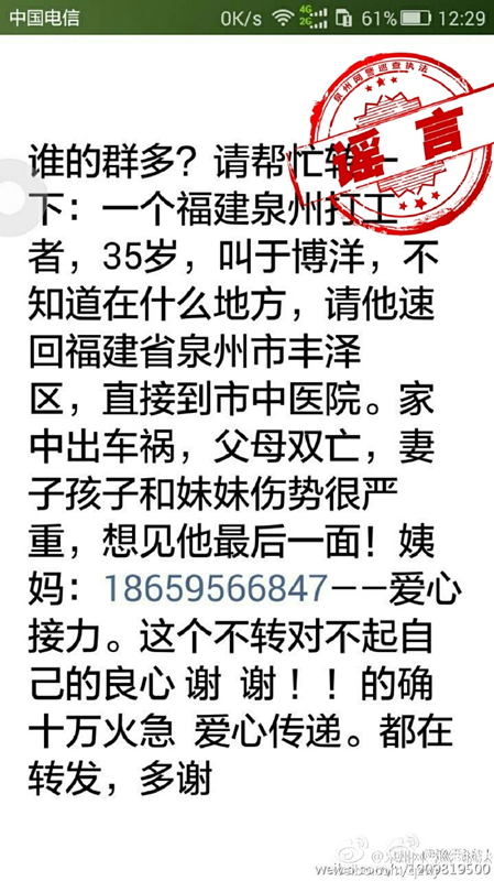 今年起,这一谣言还在继续升级,又出现了河北、江苏等全国多个省市的版本,寻人对象的姓名也在不断改变,还时而男性时而女性……10月前后,一条类似的传言称:“一个河北打工者,38岁,叫王新国,不知道在什么地方打工,请他速回河北省邯郸市广平县平固店镇北下堡村或者直接到县医院……姑姑电话:1331500XXXX——爱心接力。”对此,河北省邯郸市网络安全保卫支队“@邯郸网警巡查执法”已证实该信息为谣言:“王新国家人并未出车祸,此外所留的电话号码并不是其姑姑的电话,很多好心人给该手机持有人发送短信和拨打电话,给手机持有人的生活带来了很大的困扰。仅仅几句谣言却打破了一家人平静的生活。”