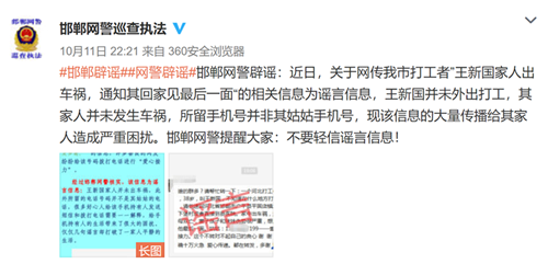 记者发现,在辟谣之后,这条谣言仍不断演变出新的版本在网络上传播。去年7月,26岁的河北沧县“于博洋”摇身一变,成为“35岁的福建泉州打工者”,情节同样是家中出车祸,亲人想见他最后一面……对此,福建省泉州市公安局公共信息网络安全监察支队“@泉州网警巡查执法”在微博进行了辟谣。