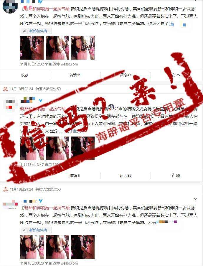 上周末,一条题为“新郎和伴娘抱一起挤气球,新娘见后当场提悔婚”的消息在微博上刷屏,一度还登上微博热搜榜,引发网友关注。随后,就有自称是事件中新娘的网友公开辟谣:这条消息是假的,图中的伴娘其实是妹妹,所谓的新郎也只是伴郎,根本没有“新娘当场悔婚”这一说。