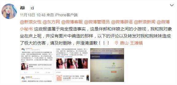11月17日,网友“@希***”发布第一条辟谣微博“没想到结婚的小游戏也能被不实报道”。11月18日,她再次发布微博称:“这些报道属于完全捏造事实,这是伴郎和伴娘之间的小游戏,我和我对象坐在床上呢,并没有图片中编造的那样,以下的评论以及转发对我和我妹妹造成了极大的伤害,请及时删除,并澄清道歉!”这两条微博同时转发给了“新浪女性”“微博辟谣”“微博管理员”“微博小秘书”等多个微博账号。