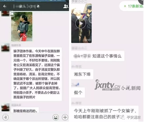 据当地警方通报,经查,上栗县出现的被锁男子是一名小偷,因为偷手机被抓了个现行,并不是网友说的拐卖小孩。湘东区出现的中年妇女刘某系流入该区的外地乞讨人员,以发糖果的形式向商铺或居民家中乞讨钱财,无犯罪前科记录,并不是拐卖小孩的违法犯罪人员。警方提醒大家不要传谣信谣。