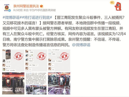 昨日,泉州市公安局公共信息网络安全监察支队官方微博辟谣,称该事件实为南宁警方在12月4日晚集中展示打黑除恶成果。