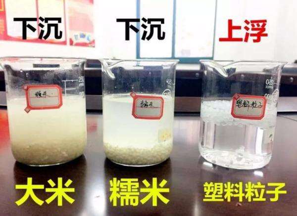 大米可不可能是塑料做的?接着,金华市食品药品检验检测研究院采购了两款塑料粒子,在检测院做了个对比实验。把塑料粒、大米、糯米同时放进水里。结果一目了然:大米、糯米沉到水底,塑料却浮在水面上,不能和水相溶。