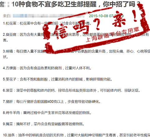 最近,一个有关“食品安全”的小视频在微信朋友圈中热传。视频中一名专家模样的男子称,卫生部发布了《10种食物不能常吃》的正式文件,包括松花蛋、臭豆腐、味精、方便面、葵花籽、菠菜等10种食物不能吃,还陈述了各种理由,如“松花蛋含铅会导致中毒”“臭豆腐含硫化氢对人体有害”等等。