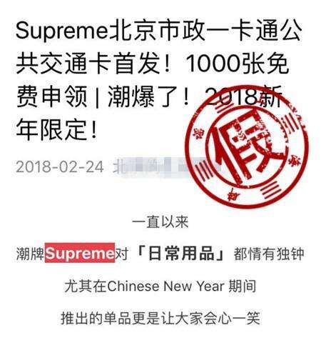 近期,朋友圈热传一篇题为《Supreme北京市政一卡通公共交通卡首发!1000张免费申领》的帖子。文章称,只要用户按照要求完成关注、转发等指定操作,就有机会免费领取Supreme北京一卡通。文中还强调,“本次活动的公交卡经亲测长期有效,可以放心使用……已经有一批‘潮人’申领成功”,还晒出不少网友使用体验的朋友圈截图。