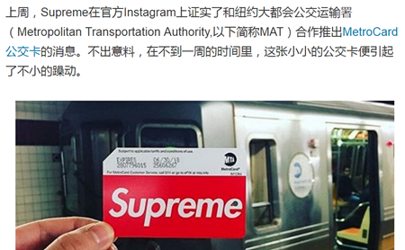 不过,记者在搜索过程中,却发现了一条Supreme品牌与美国公交卡合作的新闻。据多家媒体报道,去年2月,Supreme官方和纽约大都会公交运输署(Metropolitan Transportation Authority,简称MAT)合作推出MetroCard公交卡,由于大家对于这张公交卡的疯狂争夺,多个纽约地铁站在发售时均引发了混乱,纽约警方更是不得不出动警员维持秩序。