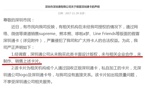 去年11月,深圳市深圳通有限公司在官方网站上也发布了澄清声明称,有相关机构在未经授权的情况下,通过网络、微信等渠道销售Supreme等版面的假冒深圳通卡。深圳通公司从未购买此类卡面设计版权,未与相关企业合作,未制作、销售上述卡片。对于未取得授权而擅自加工销售深圳通卡的行为,深圳通有限公司将保留追究其法律责任的权利。
