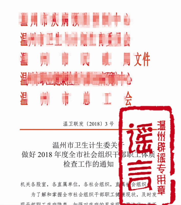 在接到多名网友举报后,温州市互联网信息办公室官方微信公众号“温州辟谣”前天发布辟谣信息:确认该《体检通知》系伪造。