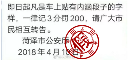 这条传言称“即日起,凡是车上贴有内涵段子的字样,一律记3分罚200元,请广大市民互相转告”,落款为“菏泽市公安厅”。此外,一些相关的论坛和贴吧中也有类似的消息流传,甚至有相关公众号文章还附上了一则新闻报道视频,称车身上贴内涵段子字样,会被罚款。