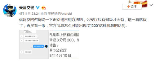 4月11日,天津市公安交通管理局“@天津交警”转发了该传言图片并发布微博表示,公安厅为省级的公安机构,并不存在“菏泽市公安厅”的说法。此外,官方通知中也不会出现“罚200”这样随意的用语,传言一看就是假的。“@天津交警”在回答网友咨询中还指出,车上贴有这种贴纸并不违法,交警不会进行处罚。