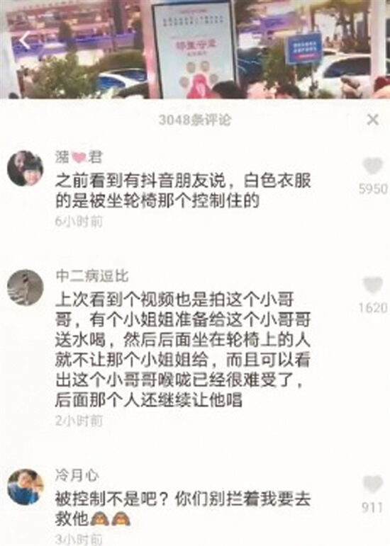 记者在微博上的视频中看到,在市区田安北路附近有两名年轻男子在街头卖唱,主要是一名年龄较小的白衣男子在唱,唱的都是些流行歌曲,吸引不少市民围观。而在他身后有一名较为年长的红衣男子坐着轮椅帮忙换歌和调试设备。由于歌声几近原唱,该视频获得超过15万个点赞,被分享转发600余次,还有3000多条评论。有网友在视频下方留言,“白衣男子是被坐轮椅的红衣男子控制住了”,“上次看到有个市民准备给白衣男子送水,然后那个坐轮椅的红衣男子不让给,而且可以看出白衣男子的喉咙已经唱得很难受了,坐轮椅的红衣男子还继续让他唱”。也有网友表示要去现场“救”这名白衣男子,但还是先报了警。记者找到用户想看原视频时,却发现该视频已被删除。