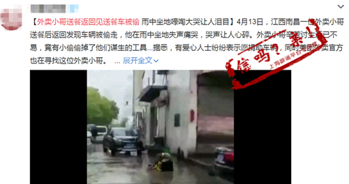 这两天,一段“外卖小哥雨中痛哭”的视频在微博和朋友圈中火速传播。视频中,一男子身穿外卖服装,坐在雨中嚎啕大哭,外卖箱和头盔也散落在地上。与视频一同转发的文字称,这是“江西南昌一位外卖小哥送餐返回后发现车辆被偷走,在雨中坐地失声痛哭,哭声让人心碎……”。