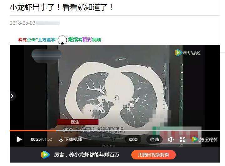 先来看原推送中的视频,视频中有字幕显示:“苏州:吃小龙虾咳血 小龙虾体内有寄生虫”。视频中有一幕,医生从小夏的肺部CT图片辨认出,这是肺吸虫新钻的孔洞。通过搜索,记者找到该视频是2016年4月13日在某卫视的播出片段。